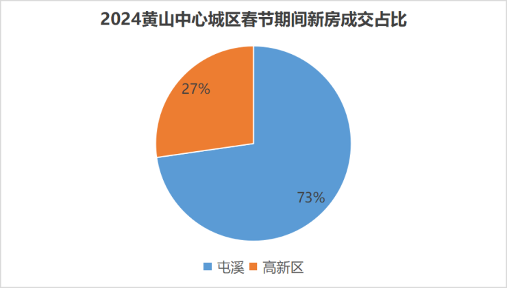 成交区域方面,2024年春节黄山中心城区新房市场延续了2023年的区域分化趋势,成交区域依旧向核心区域聚拢。其中,屯溪区域新房成交48套,占比73%;高新区域新房成交18套,占比27%。