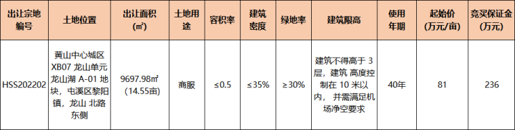 2022年9月23日,黄山中心城区 XB07 龙山单元龙山湖A-01地块(宗地编号:HSS202202)挂牌,土地位置位于屯溪区黎阳镇龙山北路东侧,出让面积9697.98㎡(14.55亩),土地用途为商服用地,容积率≤0.5,建筑不得高于3层,建筑高度控制在10米以内,并需满足机场净空要求。须引入艺术传媒产业,打造黄山国际动漫创意合作中心。土地交付之日起的4个月内(即2023年4月20日前)开工建设,开工之日起20个月内建成并正式运营(即2024年12月20日前)。
