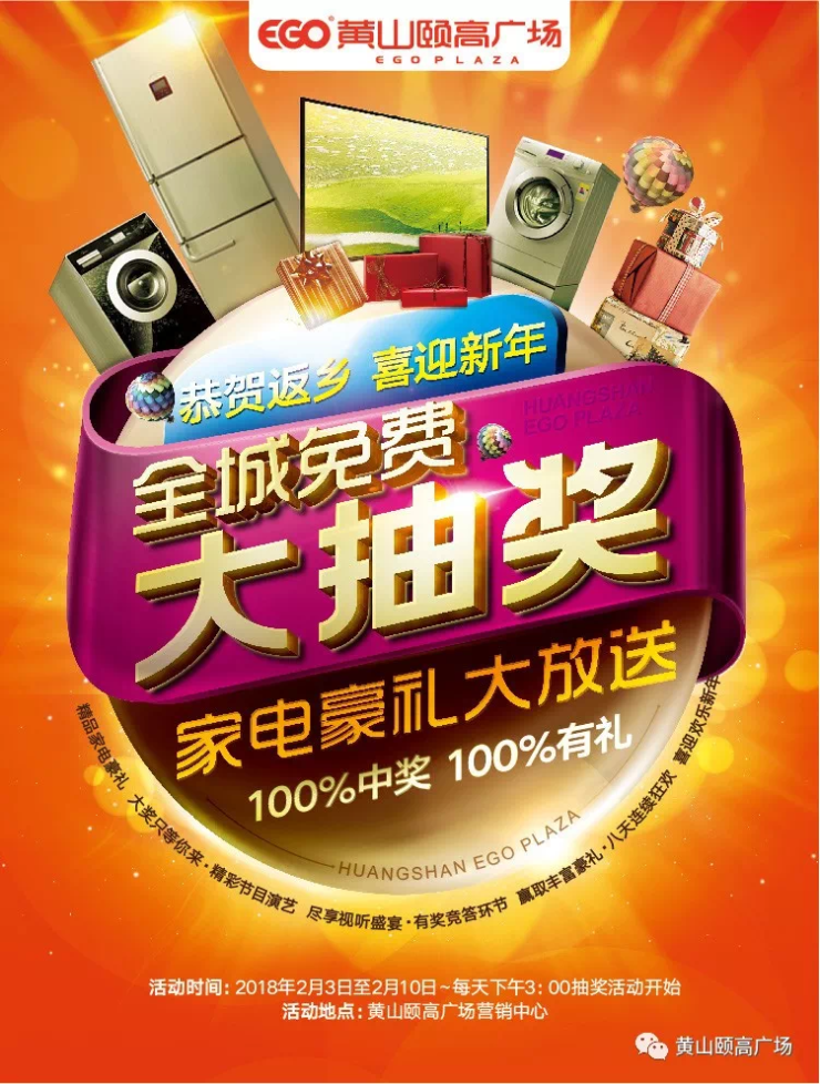 黄山颐高广场: 恭贺返乡 全城免费大抽奖 家电豪礼大放送