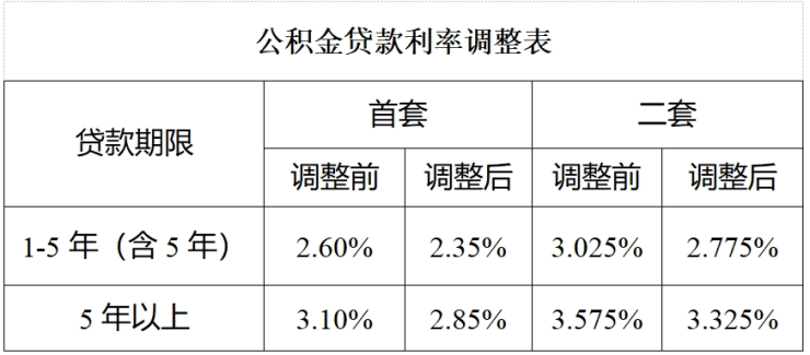首套个人住房公积金贷款利率,5年以下(含5年)利率降至2.35%,5年以上利率降至2.85%;