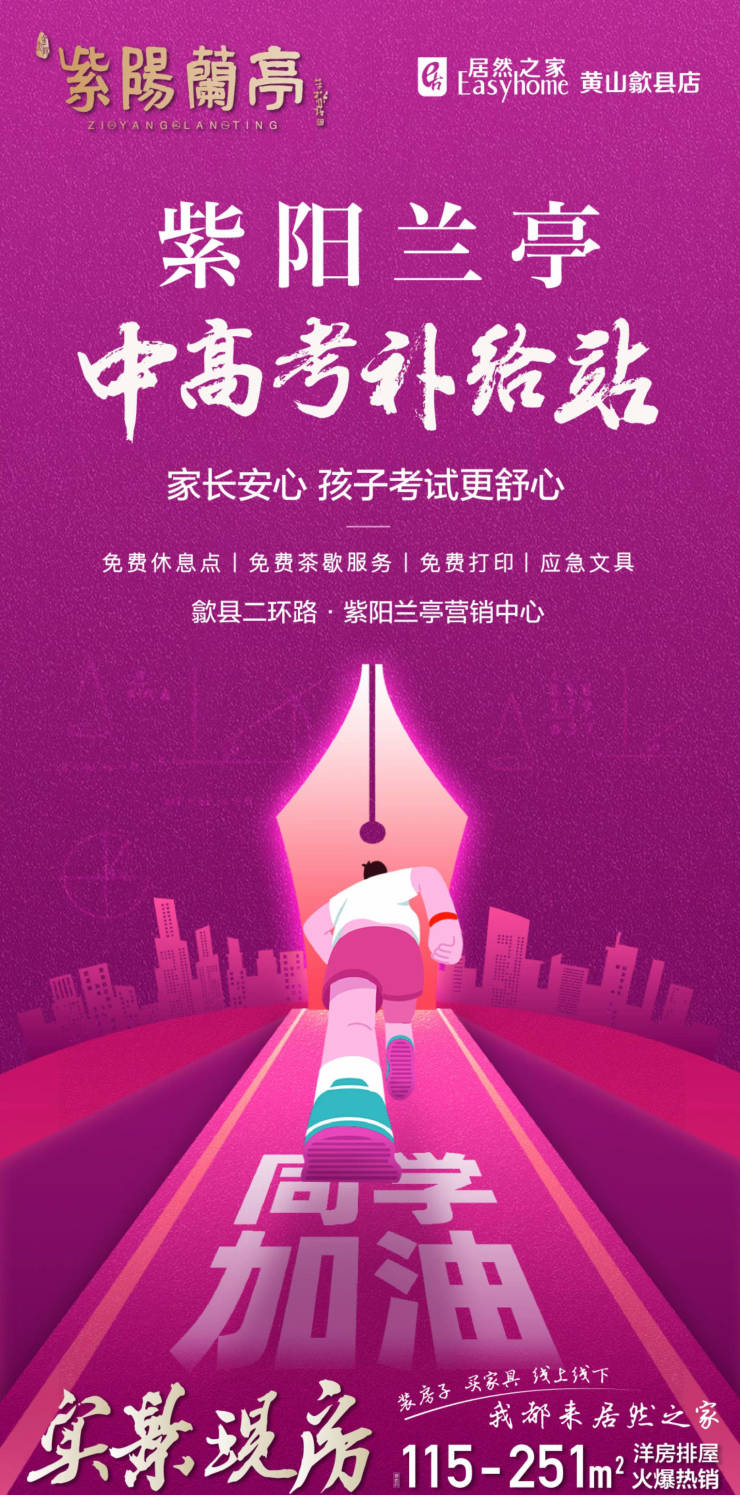 紫阳兰亭中高考补给站,家长安心,孩子考试更舒心!免费休息点、免费茶歇服务、免费打印、应急文具,地点:歙县二环路·紫阳兰亭营销中心。紫阳兰亭由深耕黄山的实力企业金太阳集团和中国家居行业龙头——居然之家两大企业联…