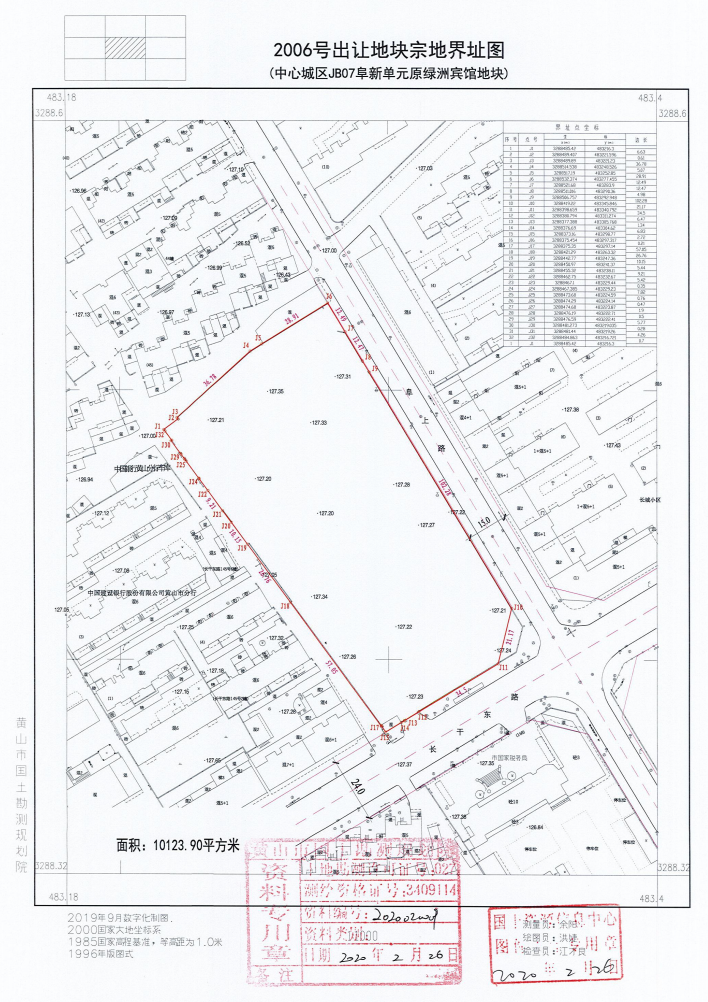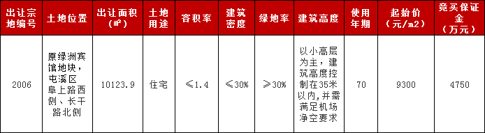 黄山中心城区原绿洲宾馆地块(2006号地块),位于屯溪区阜上路西侧、长干路北侧,为纯住宅用地。宗地出让面积10123.9㎡(15.19亩),容积率≤1.4,起拍楼面地价6642.86元/平方米。要求以小高层为主,建筑高度控制在35米以内。