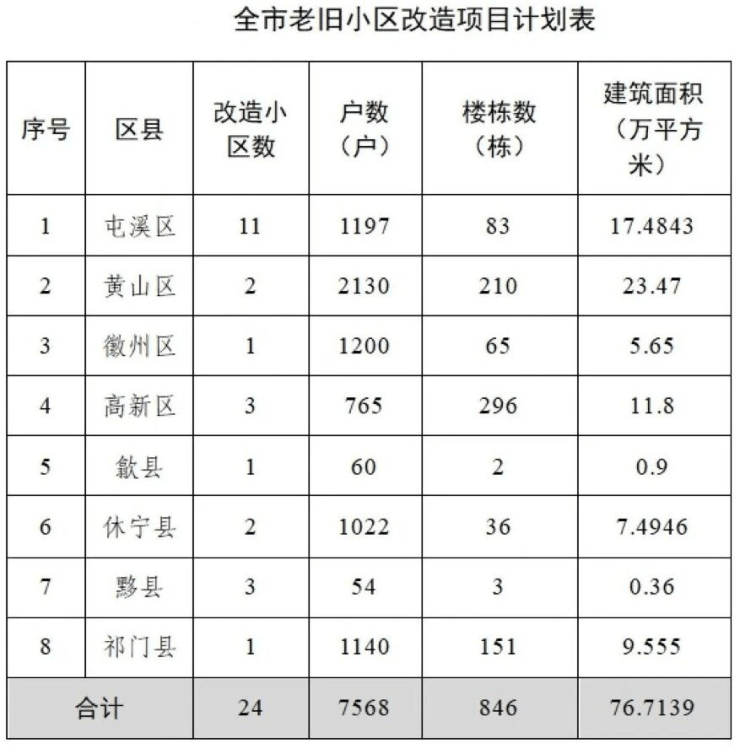 近日,黄山市住建局发布了《黄山市2026年城镇老旧小区改造实施方案》。根据该方案,全市24个老旧小区将迎来提质改造,惠及7568户家庭,改造面积超76万㎡,覆盖三区四县(含高新区)。