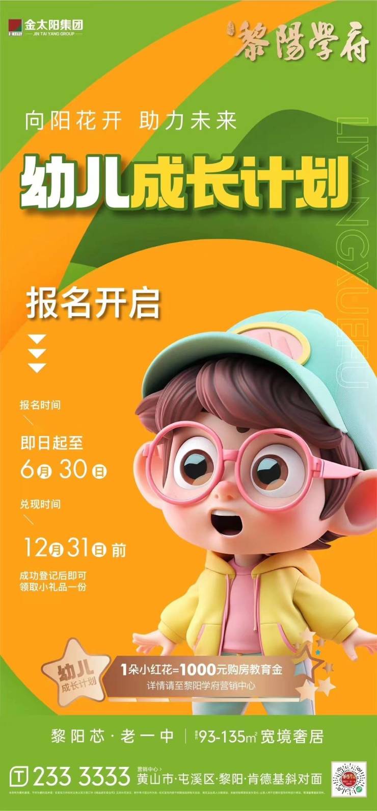 向阳花开,助力未来!黎阳学府幼儿成长计划报名开启,1朵小红花=1000元购房教育金,报名时间:即日起至6月30日,兑现时间:12月31日前,成功登记后即可领取小礼品一份。详情请咨询黎阳学府营销中心!黎阳学府,…