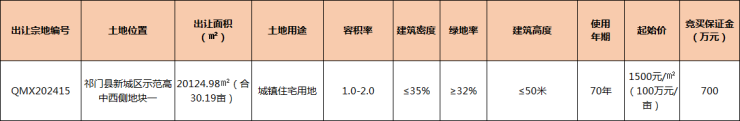 2024年9月27日,祁门县1宗住宅用地(宗地编号:QMX202415号)挂牌,总出让面积20124.98㎡(合约30.19亩),起拍总价3020万元,起拍单价1500元/㎡(100万元/亩),起拍楼面地价750元/㎡,拍卖时间:11月6日15时30分。
