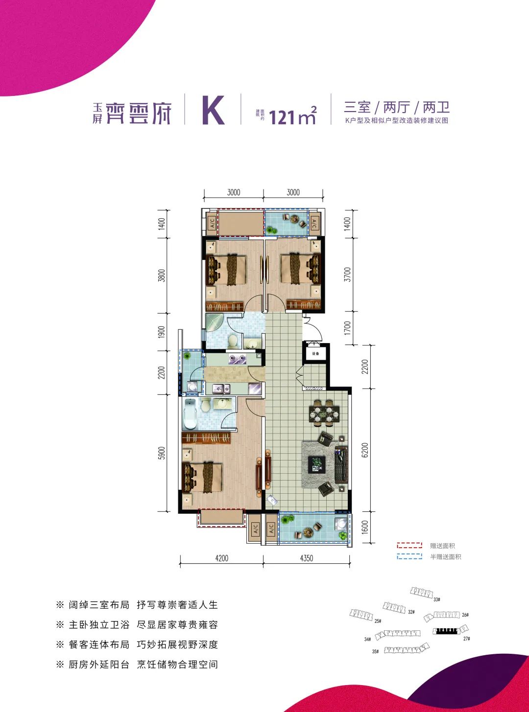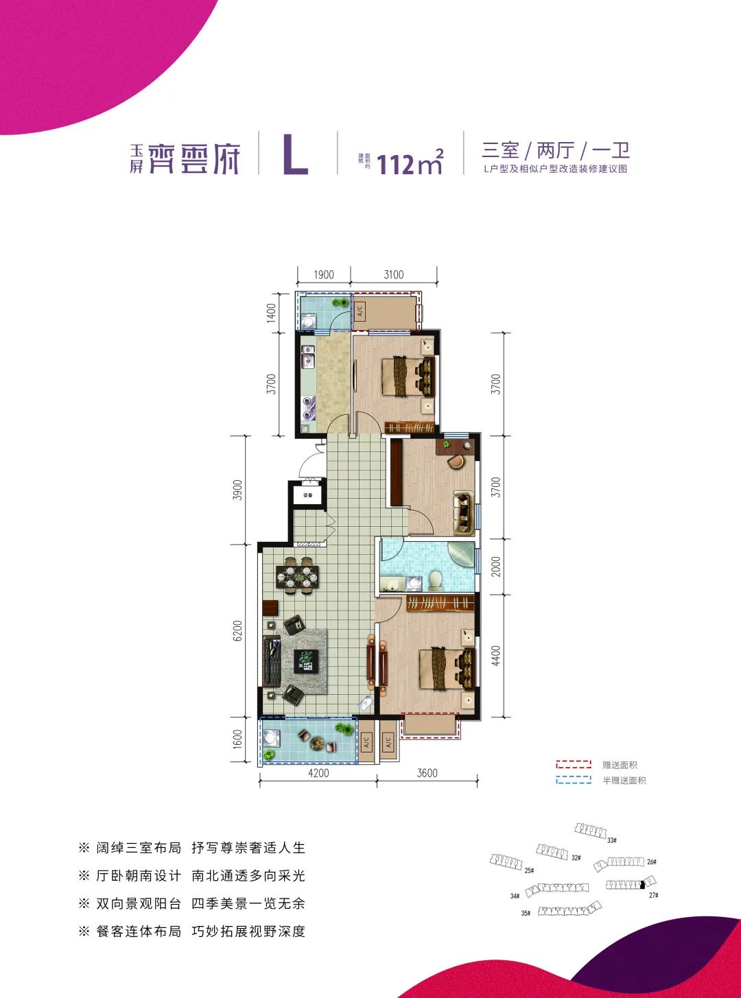 27#楼作为品质进阶的优选居所,采用一梯两户配比,将公共区域的细节考量融入户型设计,建面约112㎡-146㎡阔尺三室/全能四室,餐客厅、阳台连体布局,合理利用室内的每一寸空间,以纯粹尺度,序写非凡尊贵。