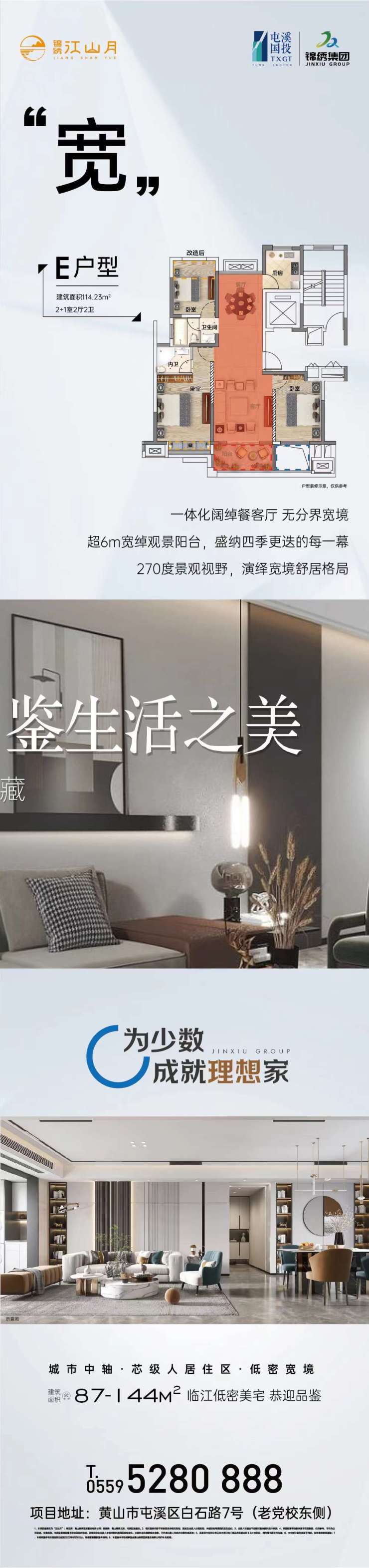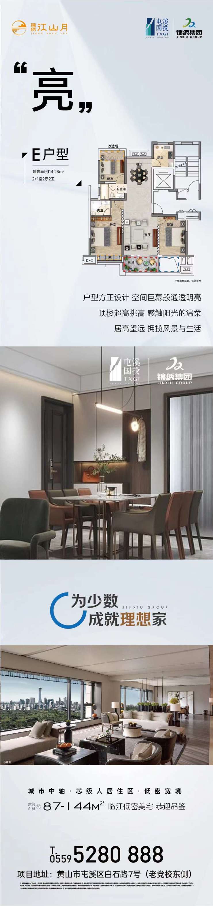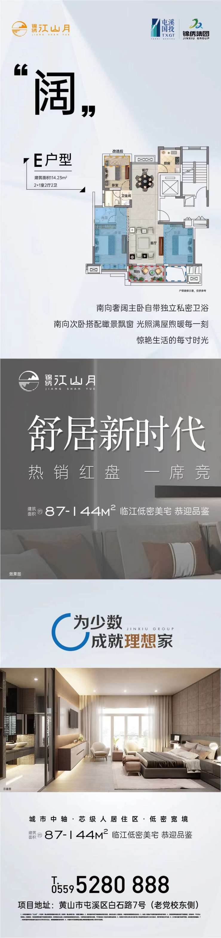 锦绣江山月是由屯溪国投、锦绣集团联袂打造的匠心力作,项目择址屯溪区新安江南岸老阳湖核心位置,位于三江口周边政府重点打造区域;接驳新安大道、徽州大道,立体交通路网;坐享街角公园、江心洲公园、南滨江景观带等生态资源;元一、阳湖农贸市场、百大商贸城、老街等商圈配套环伺;生活便利,生态环境优越。