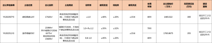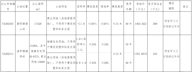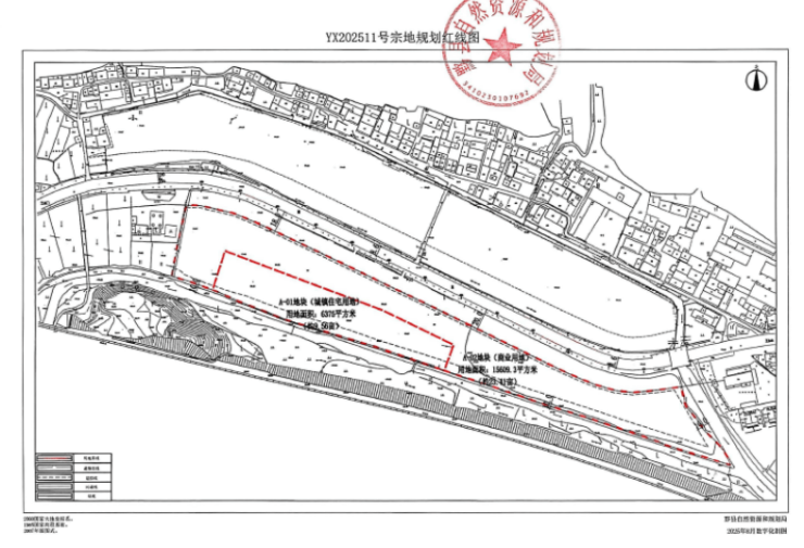 YX202511号为商住地块,总出让面积21984㎡(合32.98亩),起拍总价1765.8675万元,其中住宅用地出让面积6375㎡(合9.56亩),容积率1.0<R≤1.2;商业用地出让面积15609㎡(合23.42亩),容积率0.8-1.0。