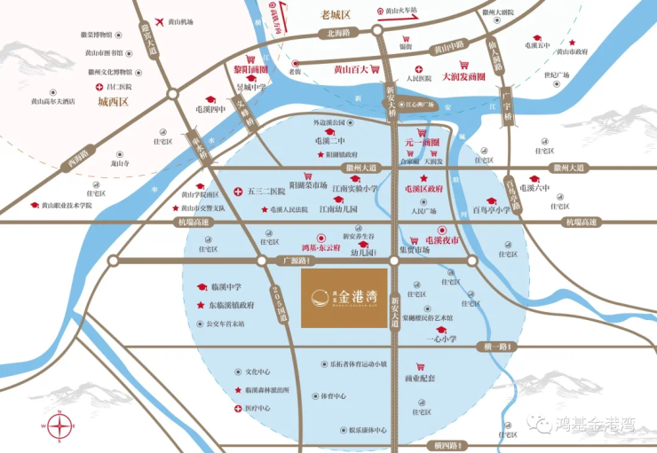 鸿基金港湾项目位于新安大道延伸段,是政府规划重点区域,205国道直通黄山国际机场,新安大桥、新安大道连接南拓交通大走廊,广源路串联江南片区优质生活圈,双城动脉之上,黄金十字路口的路网畅享高效通达;三大成熟商圈配套,出则便利繁华,进则私享静谧。