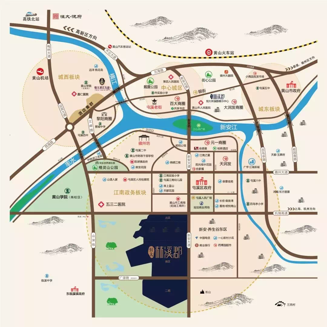黄山是一座拥有历史赋予了骄傲阅历的城市,整个屯溪目前划分有中心城区、城西板块、城东板块、江南新区板块。中心城区交通拥堵,硬件条件有限,改造起来难度较大,市中心发展受阻。城市北面为大型山脉,东西均已发展饱和。这样看来,城市向南,大势所趋。