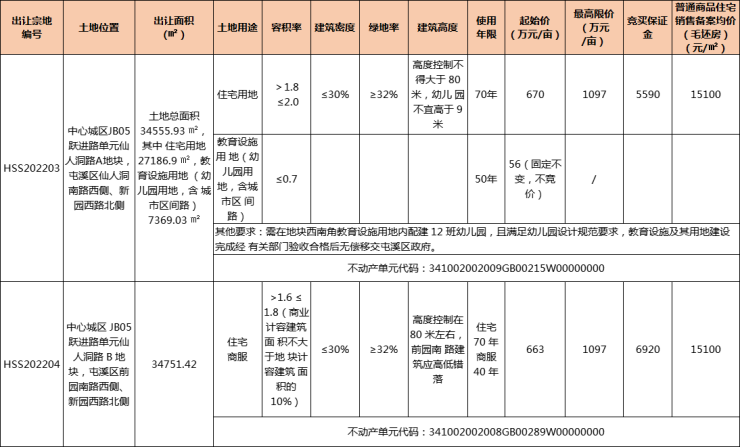 2022年11月4日,黄山中心城区JB05跃进路单元仙人洞路A地块( HSS202203 号 )、B地块( HSS202204 号)因故终止出让活动,原定于11月16日进行拍卖。
