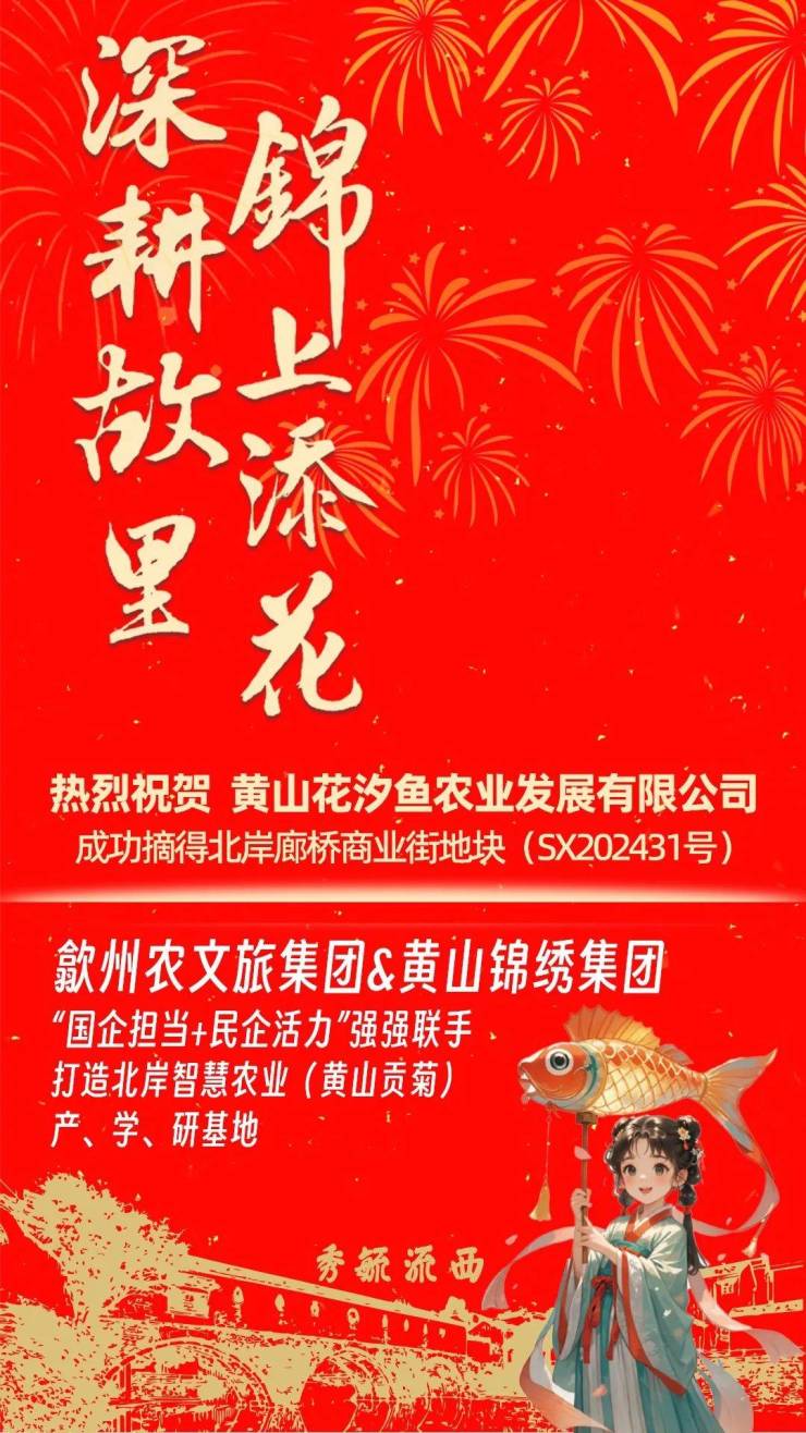·2024年11月,歙州农文旅集团与黄山锦绣集团,“国企担当+民企活力”强强联手,将依托北岸廊桥商业街地块(SX202431号),全力打造北岸智慧农业(黄山贡菊)产学研基地。