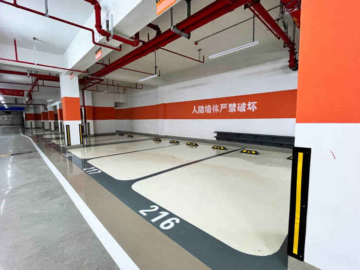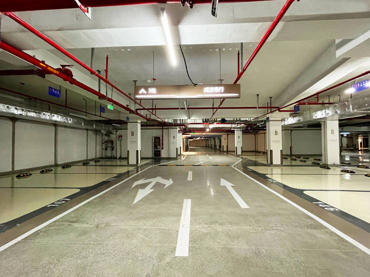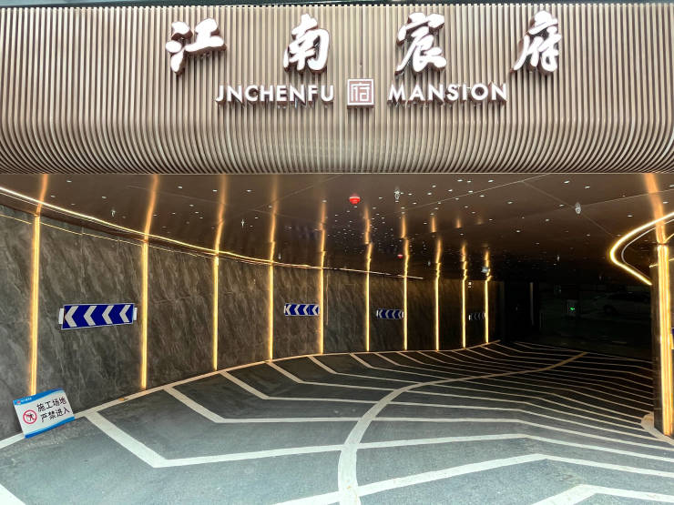 汽车入库坡道顶部采用星空顶设计,柔和的香槟金穿孔铝板上透出点点的灯光,不仅可以让出入口光线自然过渡,避免业主进入车库视线炫光,兼顾安全与高品质的属性。车库内部设计装饰则融合美观与实用于一体,地面采用固化地坪加金刚砂,让车库更加整洁明亮、打造一个防滑、耐磨、美观、安全的泊车环境。