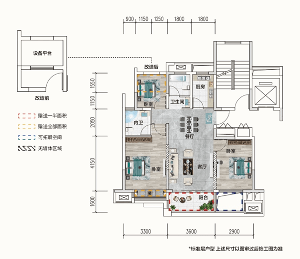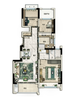 江山月预留的可改造空间非常充足,北部次卧设备平台改造后可以打造一间书房或者卧室,飘窗为全赠送面积,可以扩容主卧,南面观景阳台改造后阳台开间满满的空间感。