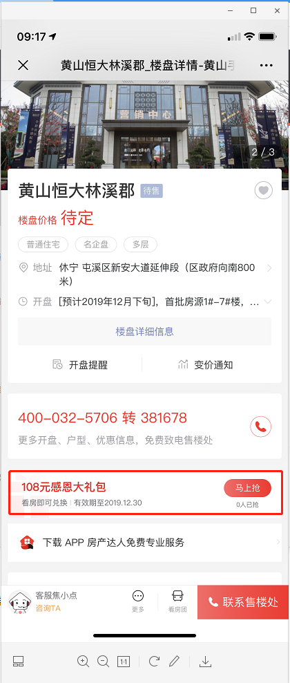 此外,搜狐焦点黄山站特别福利!黄山恒大林溪郡强势上线焦点红包通,即日起至2019年12月30日,凡进入搜狐焦点黄山站PC端、WAP端、小程序端等任意端口,打开黄山恒大林溪郡详情页点击领取,即可前往黄山恒大林溪郡售楼部免费获得价值108元感恩大礼包一份,先到先得,送完为止。