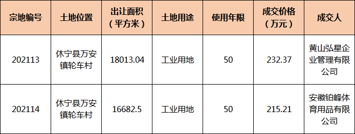 休宁县万安村2宗工业用地成交,出让面积合计34695.54㎡