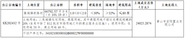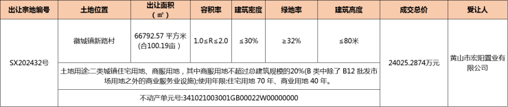 黄山市宏阳置业有限公司以底价竞得2024年12月19日歙县SX202432号地块,成交总价24025.2874万元,成交楼面地价1798.5元/平方米。