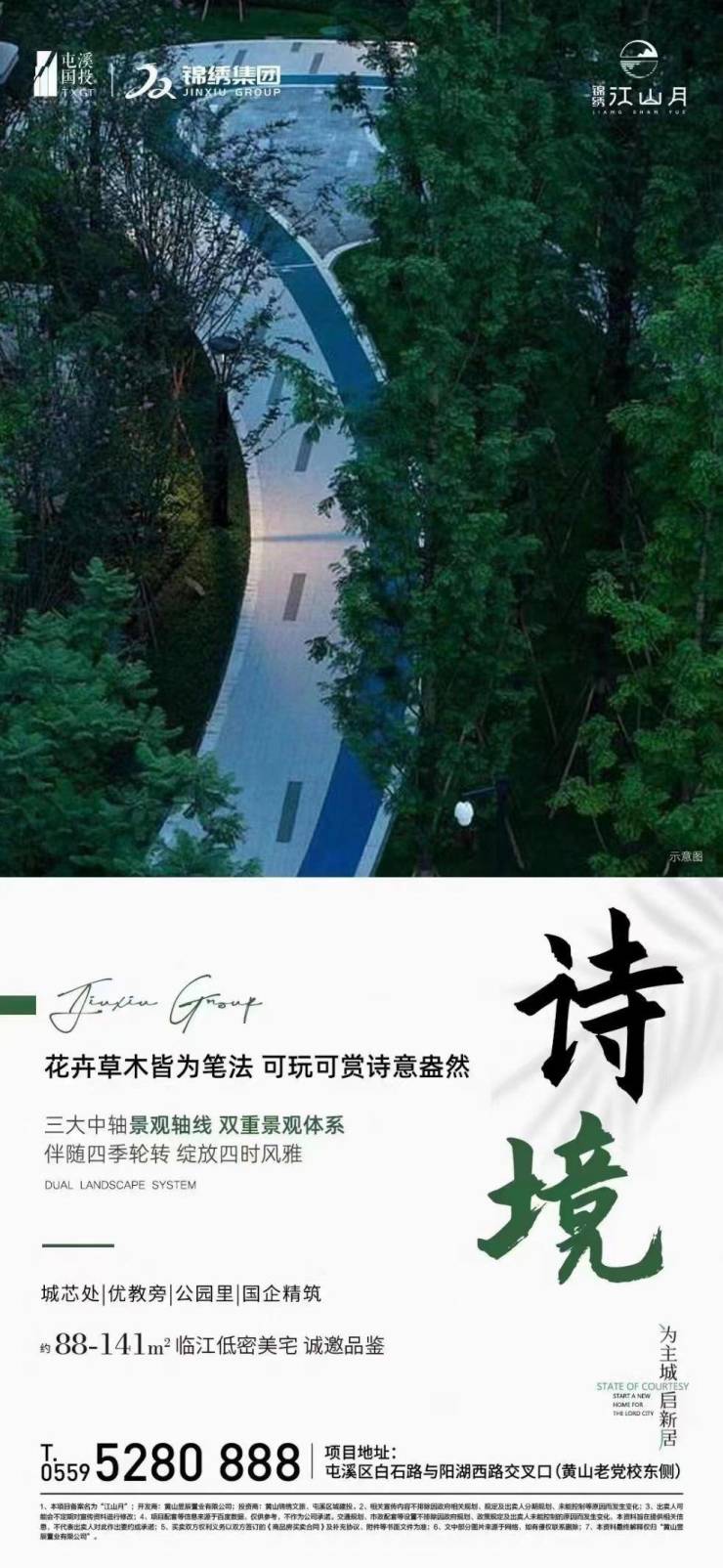 锦绣江山月是由屯溪国投、锦绣集团联袂打造的匠心力作,项目择址屯溪区新安江南岸老阳湖核心位置,接驳新安大道、徽州大道,立体交通路网。坐享街角公园、江心洲公园、南滨江景观带等生态资源,元一、阳湖农贸市场、百大商贸城、老街等商圈配套环伺。臻质美学作品,建面约87-144㎡双匠精筑,营造都市质感生活。总规划1幢6层叠墅、3幢11层及10幢14层小高层住宅。