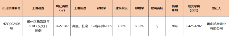2024年8月22日,徽州区昌盛路与 S103 交叉口东侧商住地块(宗地编号HZQ202405号)成交,由黄山旭徽置业有限公司底价竞得,成交总价:6425.4282万元,成交单价:2445元/㎡(163万元/亩),成交楼面地价:1630元/㎡,无溢价。
