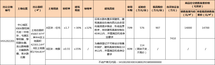 黄山中心城区XB06黎阳单元老一中周边地块(宗地编号:HSS202201),位于屯溪区黎阳镇,黎阳路东侧、龙山路南侧、文峰路西侧、率水 路北侧。地块总面积45007.97㎡(67.511955亩),起拍总价:37012.4389万元;其中,A区块占地42303.14㎡(63.45471亩),土地用途为住宅,容积率≤1.7,起拍总价36549.9129万元,起拍单价576万元/亩(8640元/㎡),较高限价为 907 万元/亩,商品住宅的销售备案均价为 14000 元/㎡(毛坯房),单套较高销售备案价为 14700 元/㎡(毛坯房);B区块占地2704.83㎡(4.057245亩),土地用途为商服,容积率≤0.55,起拍总价462.5259万元,起拍单价114万/亩(1710元/㎡)(固定不变,不进行竞价)。
